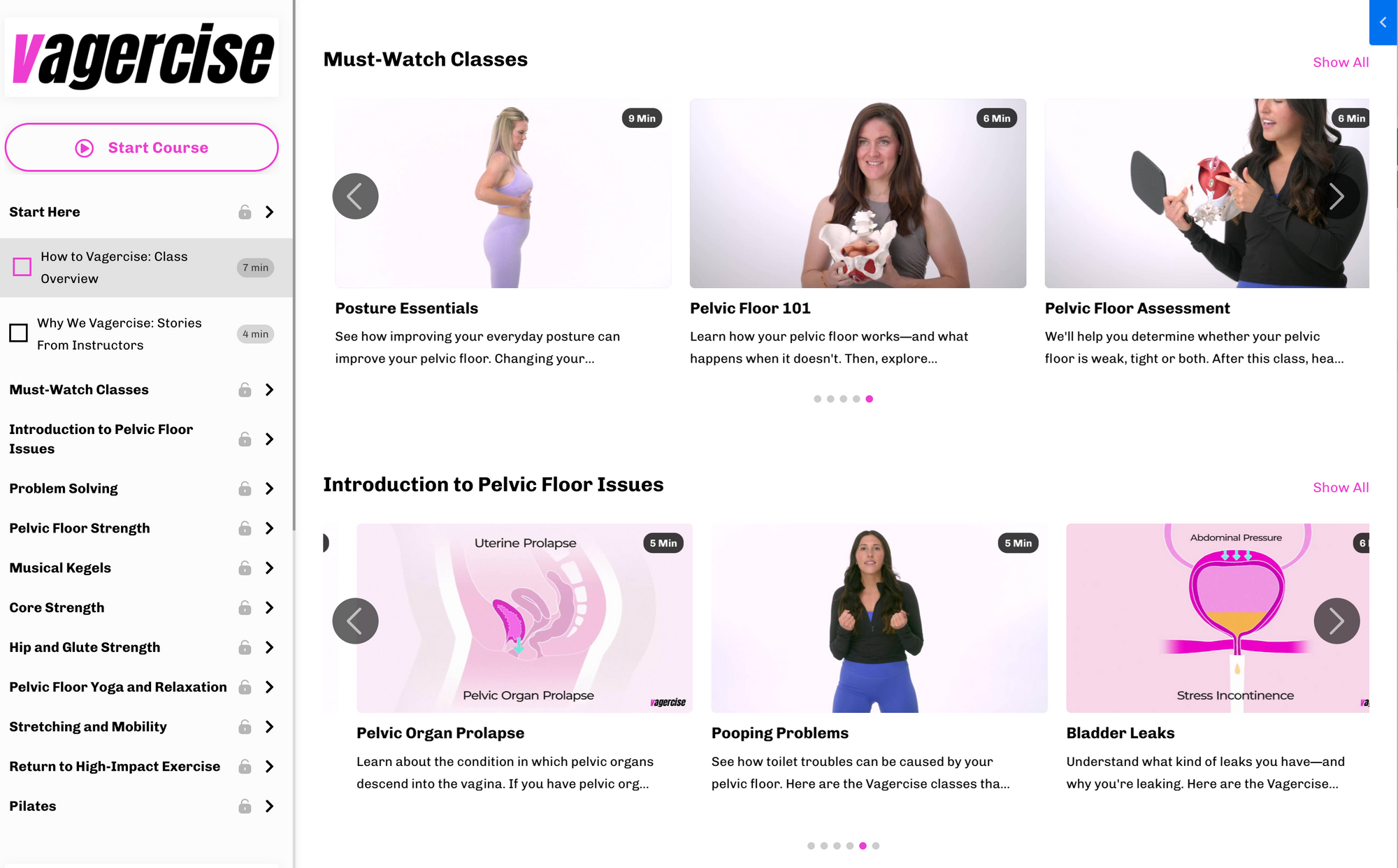 The Vagercise course includes six levels of Pelvic Floor Strength, Core Strength and Hip and Glute Strength, designed by PTs to build your foundational strength.